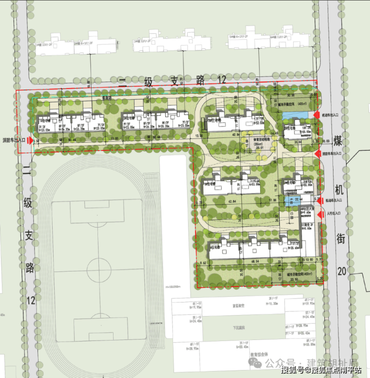 小区的人行、车行出入口均位于东侧煤机街上,西侧仅有一个消防出入口。1#、3#、5#、7#为装配式建筑。同样也是用地比较小,留给景观的空间的不多。