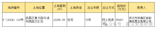 地块位于武昌区复兴路与读书院路交汇处,由武汉市武昌区(国资旗下)旅韵雅筑置业有限公司拍得,成交楼面地价约11565元/㎡,溢价率0.56%。