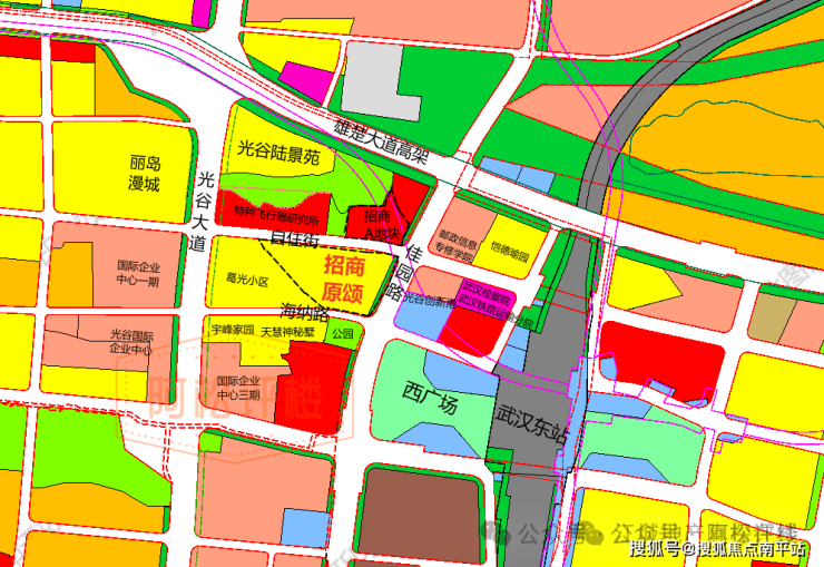 东侧为佳园路、光谷创新港、省检察院武汉铁路运输分院、武汉东站西广场、铁路线等;