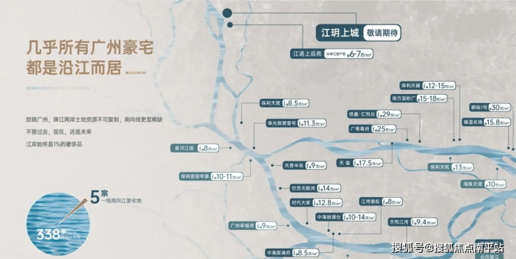 【占据1%稀缺资产】广州今年土地拍卖338宗地块,仅有1%是一线南向江景住宅,珠江两岸土地资源不可复制,南向线更显稀缺,江岸始终是1%的奢侈品。