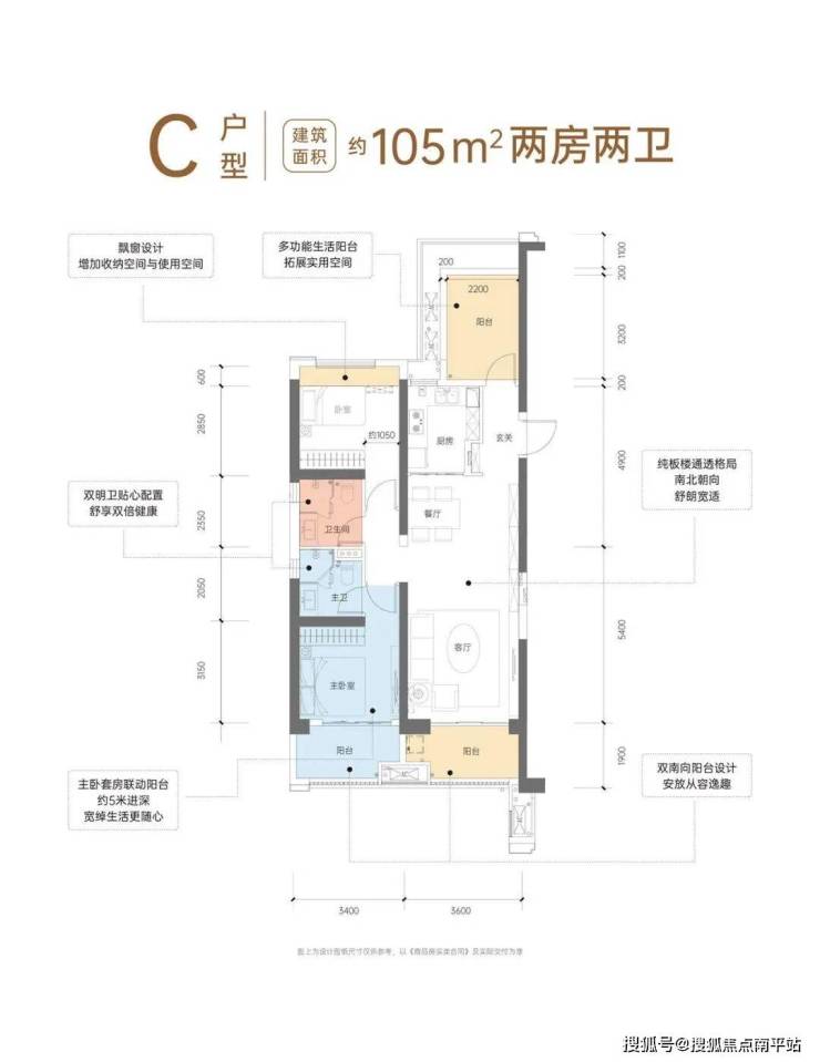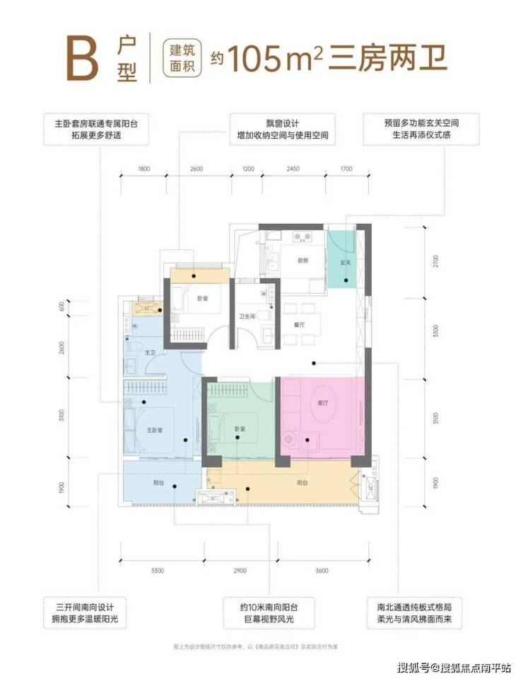 主卧套房设计,专属南向阳台空间与卫生间飘窗设计,舒适从容