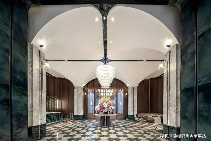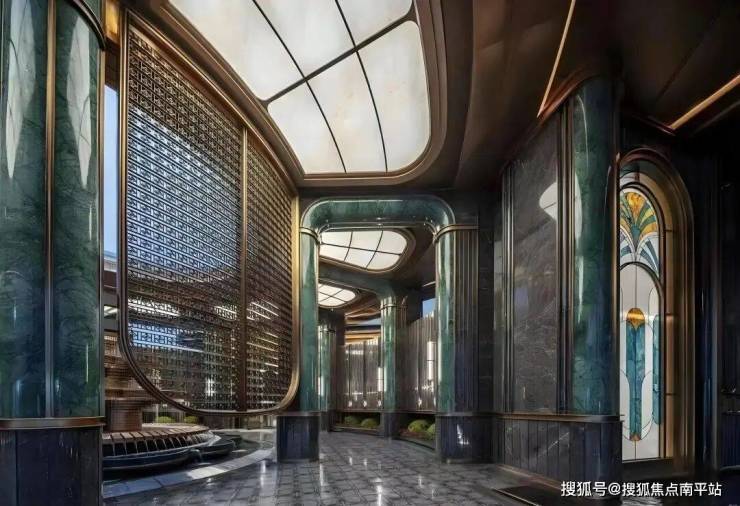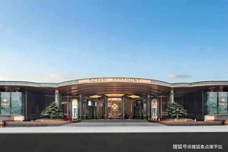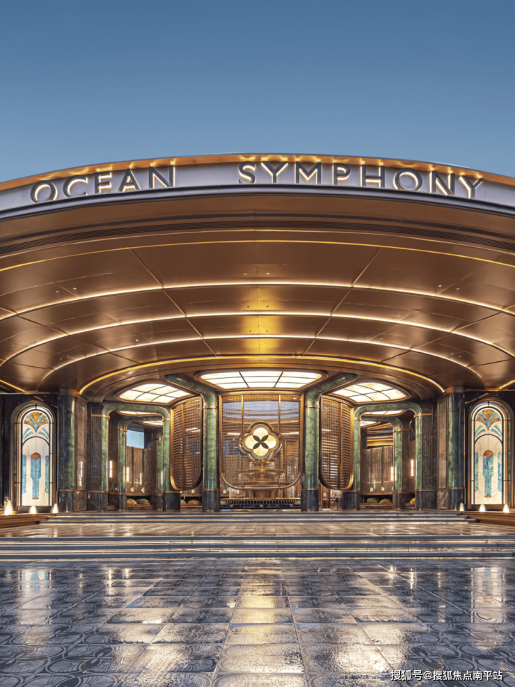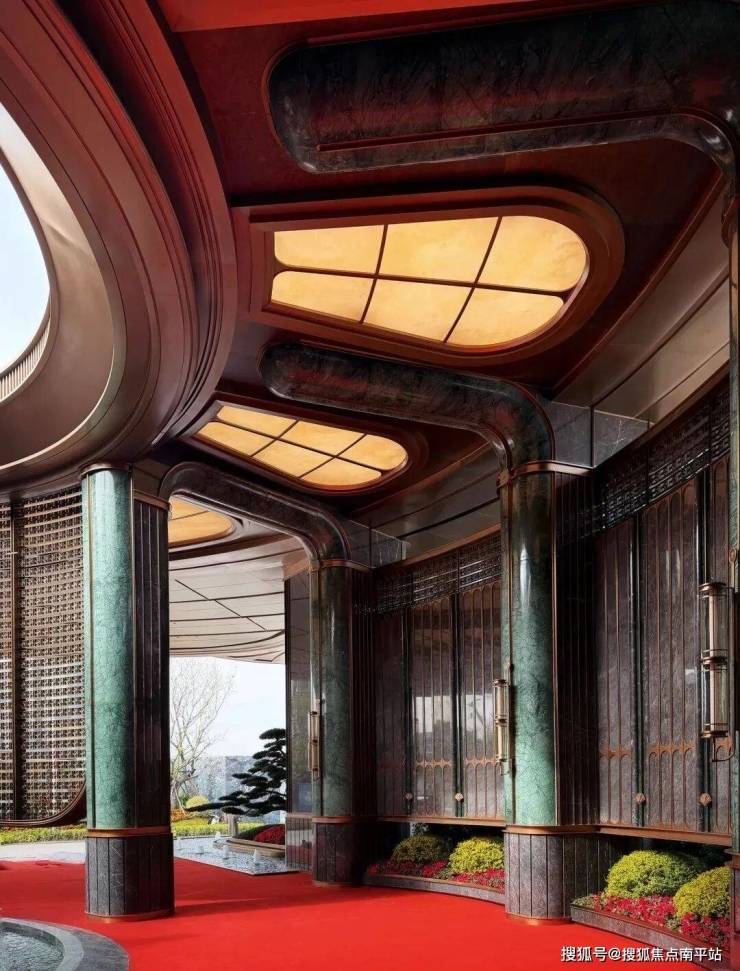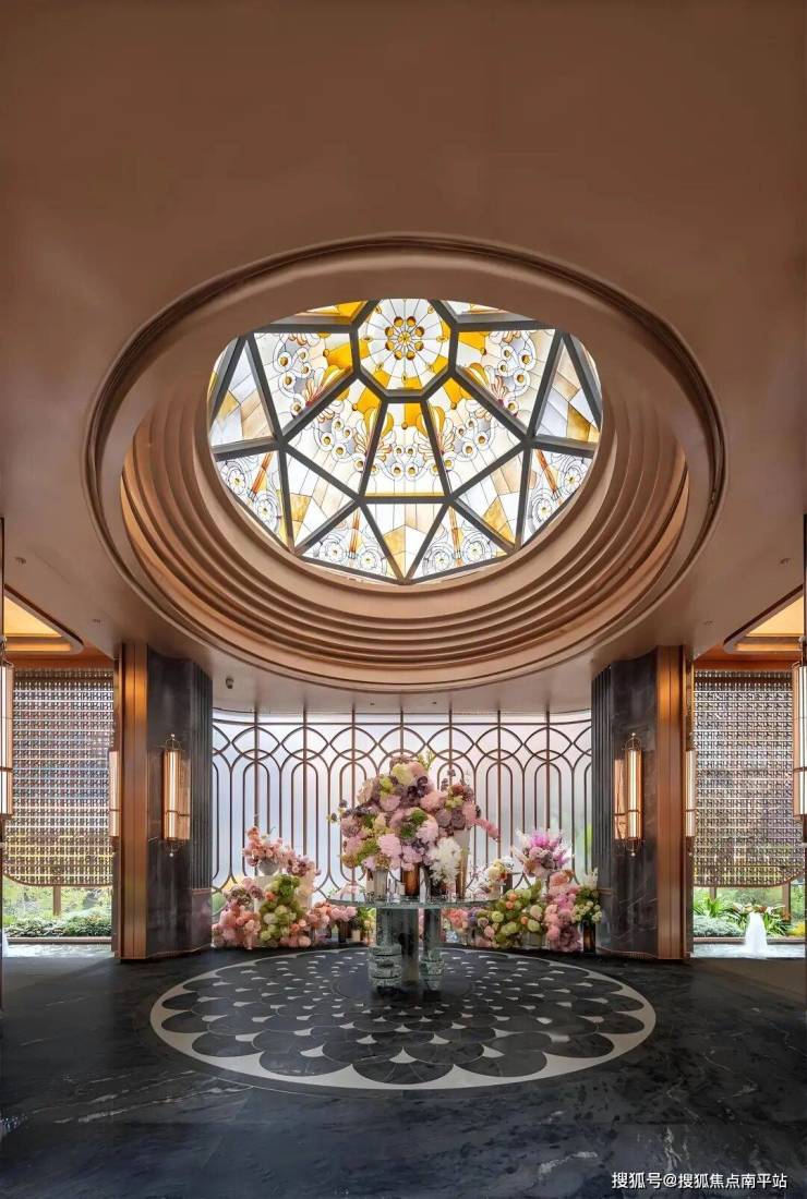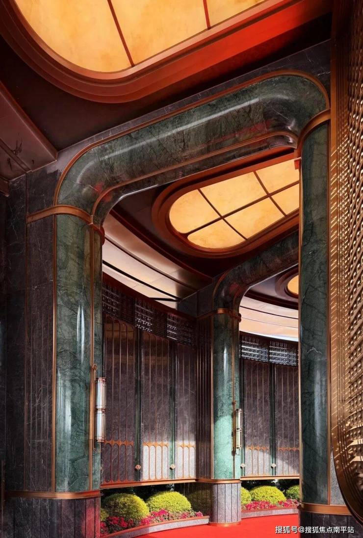 约76.7米宽、8.8米高的宏伟尺度,位列岛外最大门庭之一。 以海派南洋风为基调,复刻鼓浪屿八卦楼的中轴对称形制,尽显经典格局。双圆悬挑云母石鎏金穹顶,灵感源自容谷别墅与客家土楼,寓意圆满和谐;奢石景墙、迎客松与闽南花砖铺地,构筑层次丰富的空间意境; 悬浮金属格栅融入非遗珠绣工艺,点缀海棠纹与扇形纹样,彰显细腻工艺与东方美学。