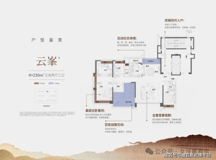 户型在项目原有的231户型4+1的基础上,239户型设计为标准五房设计,市场上同等面积段的产品只有四房,这个户型功能型更强,多一间房的设计可以为业主带来独立的居住、办公以及休闲空间,让生活更加惬意。