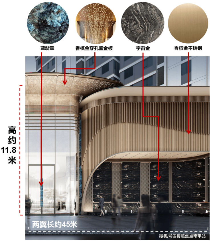 通过蓝翡翠、宇宙金等奢石,搭配香槟金穿孔鎏金板、香槟金不锈钢,定制“鲲鹏展翅”大门造型。