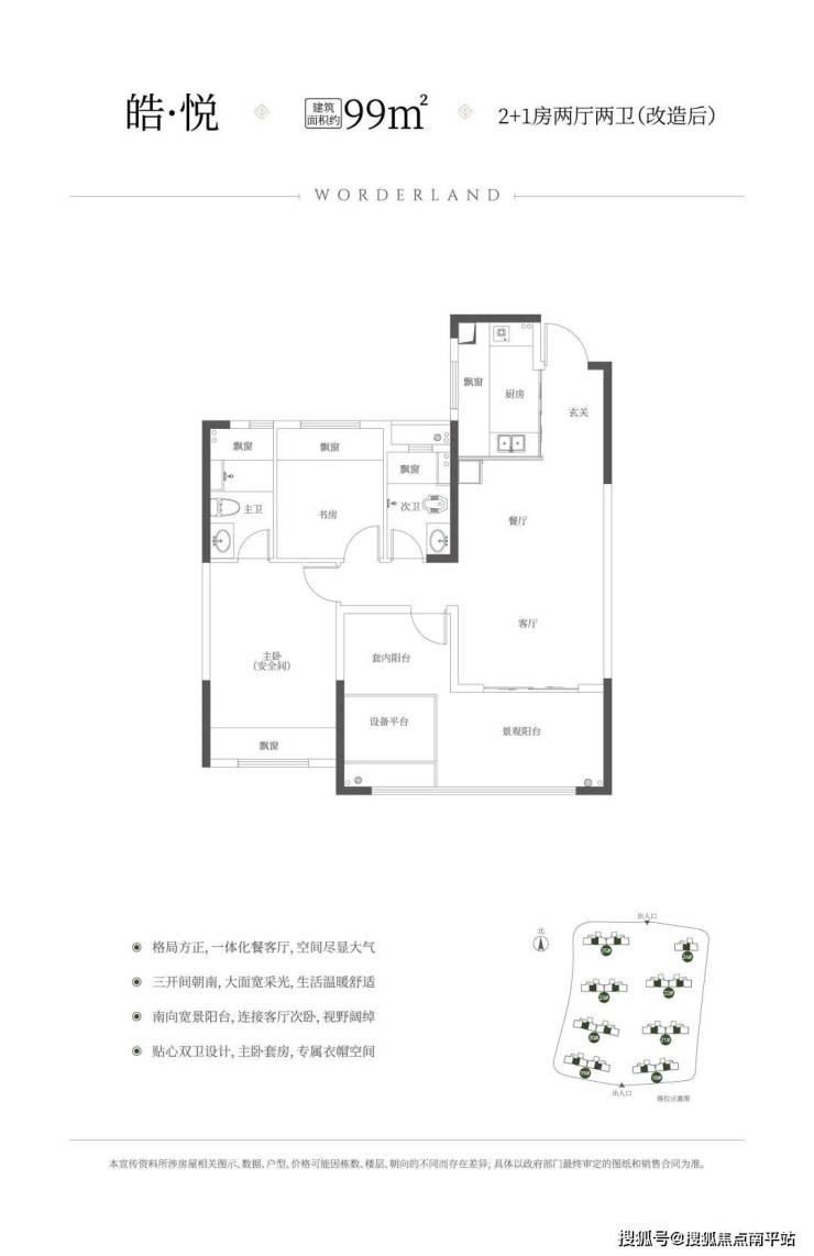 首发新规建筑面积约99㎡2+1房、约3.9m客厅开间、三开间朝南、得房率约102%