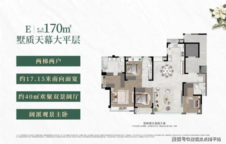 两梯两户, 约17.15米南向面宽,拥有 约40㎡双景客厅、U型中西双厨及舒适主卧套房,空间尺度宽绰,适合多代家庭。