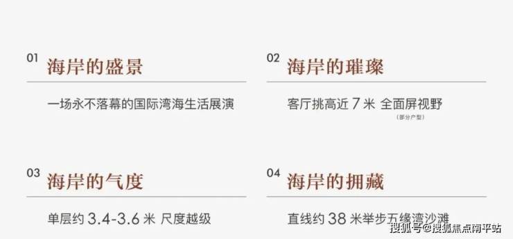 第二排 小院墅面积190-210㎡,兼顾舒适度与私密性。 第三排 洋房 170-180-333㎡多元户型 , 其中下院170-210㎡、平层180㎡、顶复333㎡, 第四排 规划4栋四代高层,面积段235-280-325㎡。产品自带6米挑高设计,搭配超11米巨幕客厅,坐拥一线海景视野,观景体验拉满。 这样的户型分布,也足以反映出项目定位之高以及面向客群之优质。