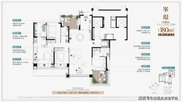 约21米的南向面宽、超100%的得房率、独立电梯厅与双开门设计, 共同定义了平层的墅级体验。 约5.8米横厅与独立茶室、中西双厨构成的社交主场,以及可轻松容纳多代同堂的五房三套卧格局, 使其成为满足家族长远居住需求的理想居所。