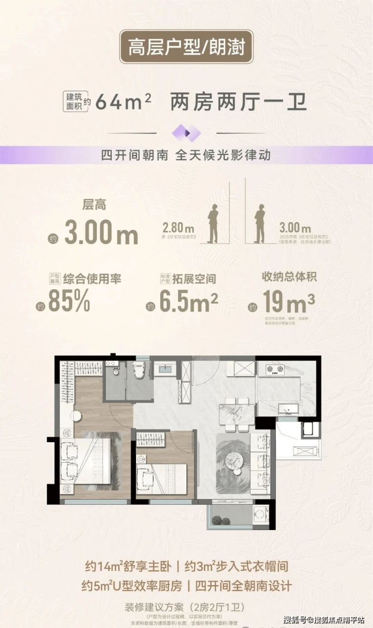 其中64㎡精装两房得房率85%,客厅卧室全朝南,主卧带衣帽间,顶配精装+智慧社区,主打小而精。