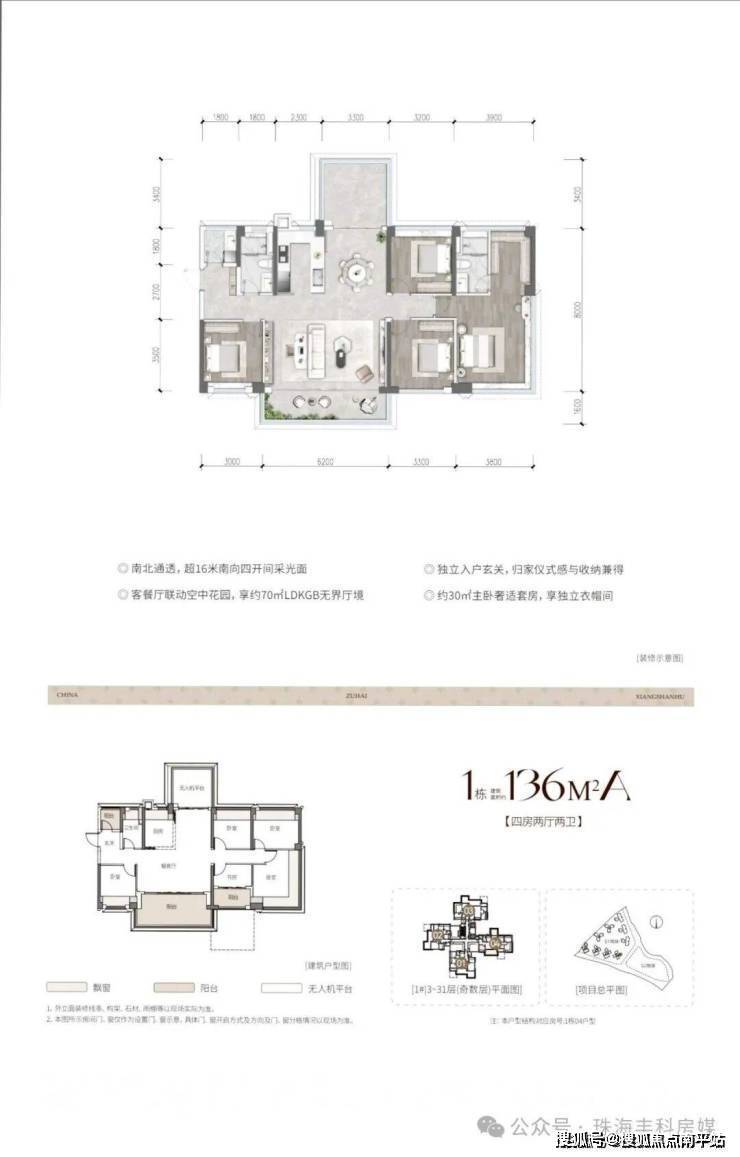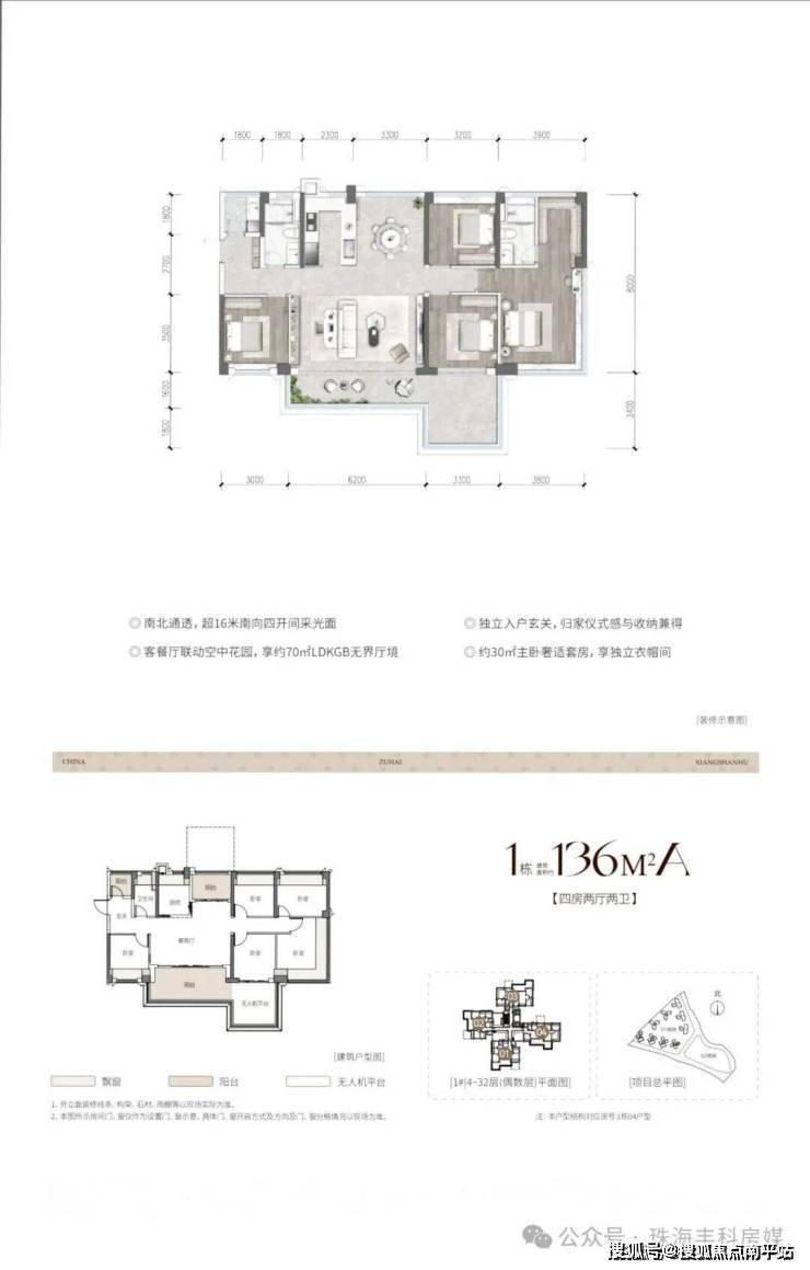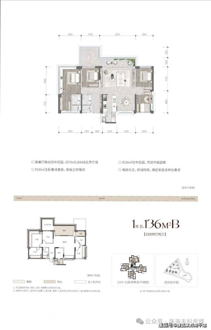 作为珠海市“四化”新型住宅试点,达到智慧住宅三星级标准,每户配备3m×3m无人机物流投递平台(不计入产权面积)。建筑采用“未来舱”式设计,外立面以大面积玻璃和几何线条打造现代质感,空中花园平台错层布置保障隐私。