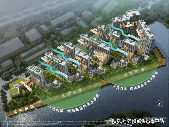 产品主要以小高层和叠墅为主,其中16栋为14-16层的小高层住宅,5栋临河的4层叠墅。由于临近军区的原因,所以朝向不是正南,而是偏西南,小区设计南低北高,东侧的临河位置由于限高15米,做了5栋4层高叠墅,西侧也是小高层15-16层设计。
