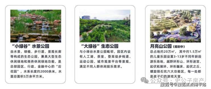 ???“小绿谷”水景公园:由水景、绿植、步行道、景观长廊等构成的生态公园,兼具大型生态休闲绿地和商务休闲绿地功能。