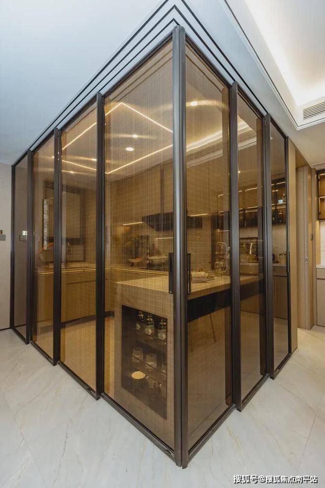 玻璃移门+互动岛台的组合,代替了传统的墙体阻隔,不仅进一步打开室内空间视野,还让厨房的操作性和互动性更强。