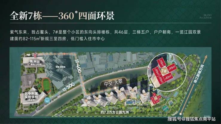 而中交·天翠,围绕“公园九洲”主题,打造 约7.2万㎡内外双园,相当于10个标准足球场大小(一个国际足球场面积约为7160平),是当前海珠西仅有的、配置超大公园的新盘。