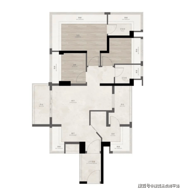 竖厅就是比较经典的格局,同样带有入户花园;横厅为五面宽朝南+南北对流。