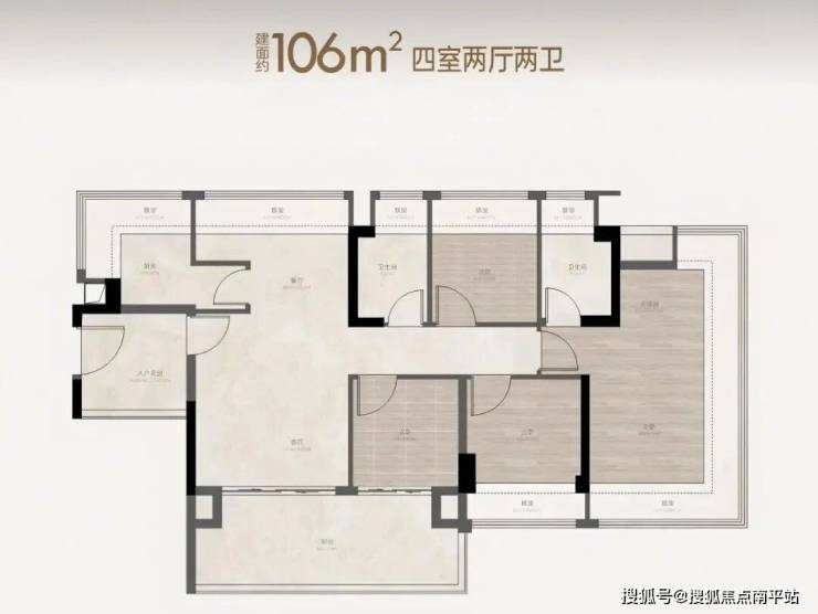 建面约106㎡四房户型, 实现了五开间朝南的极致采光,同时形成了南北通透的对流格局。