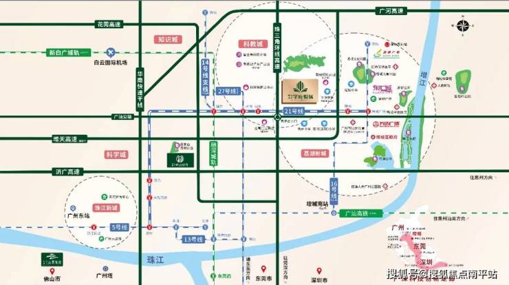 项目地处21号线山田地铁站与钟岗地铁站中间,距离都2公里左右,走路基本要半个小时,很明显的不现实,最好的骑个电动车接驳,坐地铁一个站到增城广场站换快线,5个站就可以到天河。