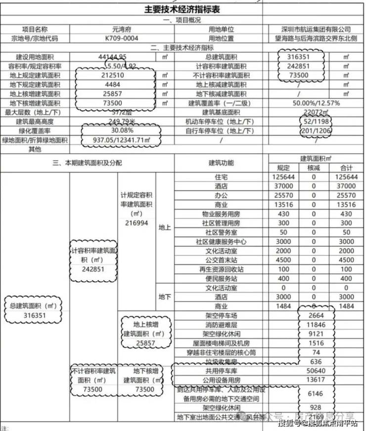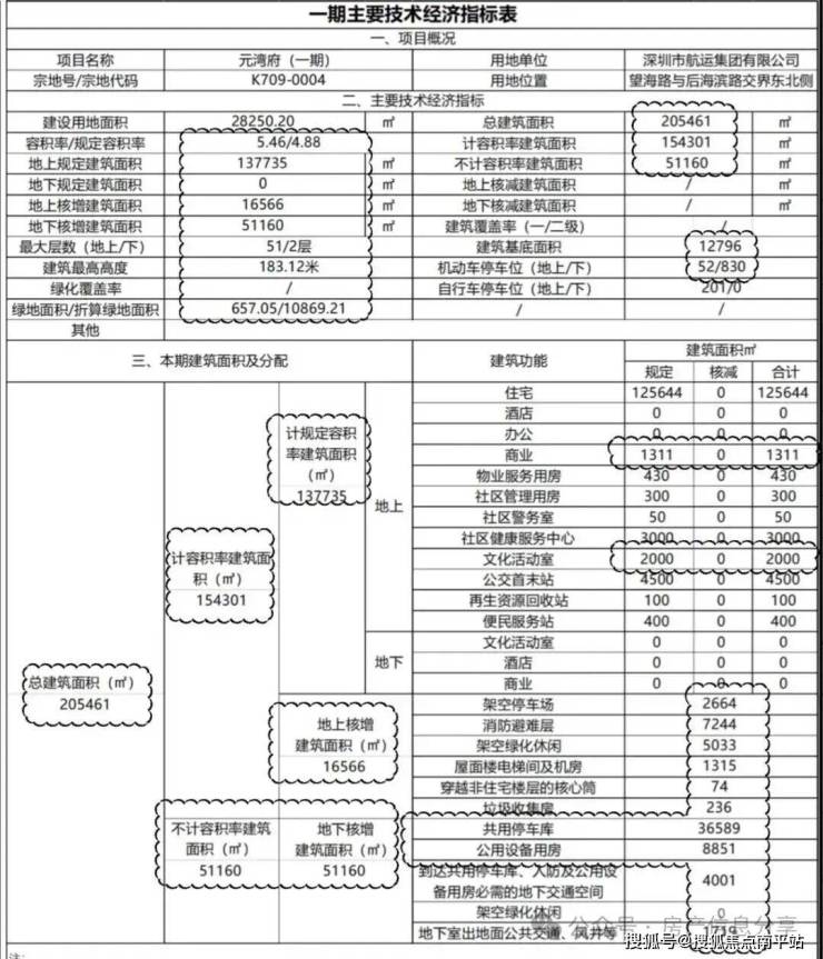 一期指标表修改:总建筑面积由207205平方米调整为205461平方米,计容积率建筑面积由156113平方米调整为154301平方米,容积率由5.53调整为5.46;计规定容积率建筑面积由137577平方米调整为137735平方米,其中商业面积由3153平方米调整为1311平方米,文化活动室由0平方米调整为2000平方米;地上核增建筑面积由18536平方米调整为16566平方米,地下核增建筑面积由51092平方米调整为51160平方米;建筑总高度及层数由54/2层、192.42米调整为51/2层、183.12米;建筑基底面积由11803平方米调整为12796平方米。总指标表相应修改。
