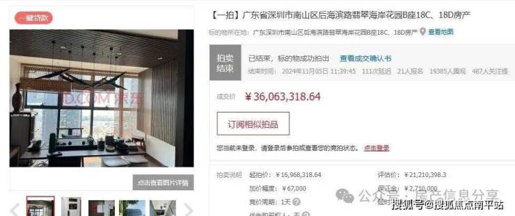 无敌看海的住宅中信元湾府,隔壁一路之隔翡翠海岸都卖20万的二手房,11月5日,翡翠海岸一套177平的法拍房有21名客户参与竞拍,加价219次,最终以3606.3万成交,成交单价20.4万/平,比起拍价高出1909.5万。