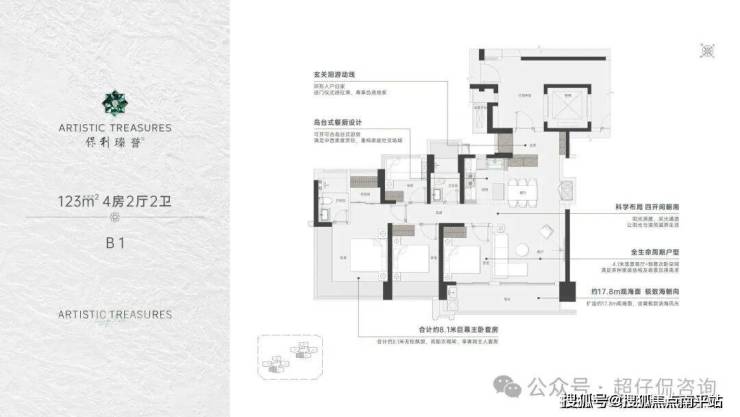 户型面积布局B123平四房两厅两卫设计的是竖厅格局,独立专梯入户,送约6㎡的私用公区,客厅4.2米开间,LDKB一体化,S墙设计预留冰箱卡槽位,动静分区,四开间朝南,主卧270°无柱转角飘窗,4个卧室分别做到了主卧23.1㎡/次卧11.2㎡/次卧8.64㎡/次卧6.25㎡(包含墙体飘窗),客厅连接次卧出6.9米长的瞰海大阳台,L型岛台式厨房,烟道外置,卫生间干湿分离,得房率约77.7%(包含赠送),西南朝向看海景。套内面积96.06㎡+赠送18.12㎡=实用面积114.18㎡,加上得房率约92.34%(不含公区)。