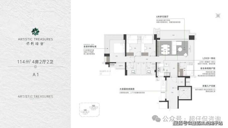 户型面积布局A114平四房两厅两卫设计的是横厅格局,独立专梯入户,送约10㎡的私用公区,客餐厅6.8米开间,LDKB一体化设计,主卧270°无柱转角飘窗,赠送1个约1.6㎡设备平台,4个卧室分别做到了主卧20.6㎡/次卧10.45㎡/次卧10.45㎡/次卧7.12㎡(包含墙体飘窗),客餐厅出6米长的观景大阳台,U型厨房,烟道外置,卫生间干湿分离,得房率约77.7%(包含赠送),东北朝向看新安中学。套内面积89.48㎡+赠送24.92㎡=实用面积114.4㎡,加上得房率约99.32%(不含公区)。