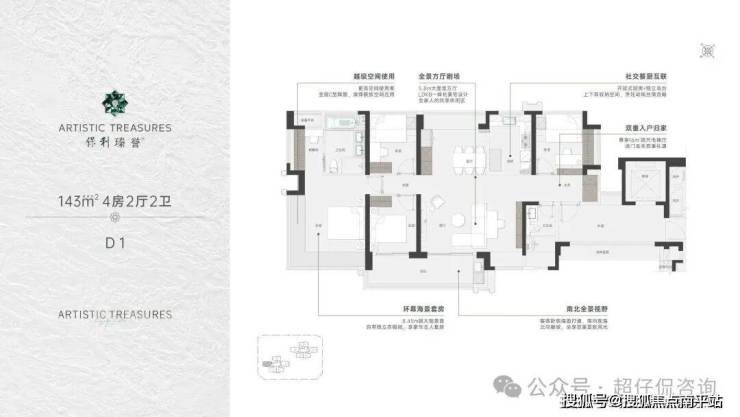 户型面积布局D143平四房两厅两卫设计的是横厅南北通透格局,独立专梯入户,送约12㎡的私用公区,客餐厅7.65米开间,LDKB一体化,四开间朝南,主卧270°无柱转角飘窗,4个卧室分别做到了主卧27.8㎡/次卧11.4㎡/次卧11.2㎡次卧11㎡(包含墙体飘窗),客厅出5.8米长的瞰海大阳台,L型岛台式厨房,烟道外置,公卫三段式分离,得房率约77.7%(包含赠送),西南朝向看海景。套内面积111.43㎡+赠送30.47㎡=实用面积141.9㎡,加上得房率约98.93%(不含公区)。