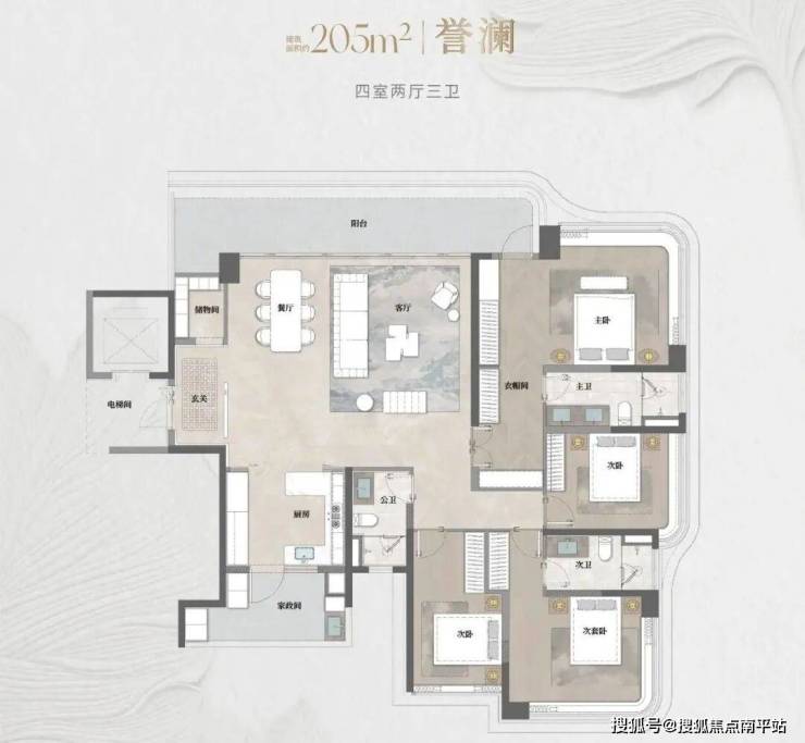 建面约205㎡【誉澜】户型:超10.5米极阔观景台,42㎡LDKB洄游方厅,空间通透感与实用功能平衡。