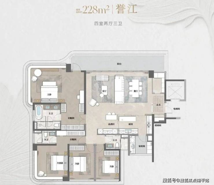 建面约228㎡【誉江】户型:近12米超宽江幕观景台,67㎡LDKB云峯会客厅,三卫设计,适合多代同堂的大家庭。