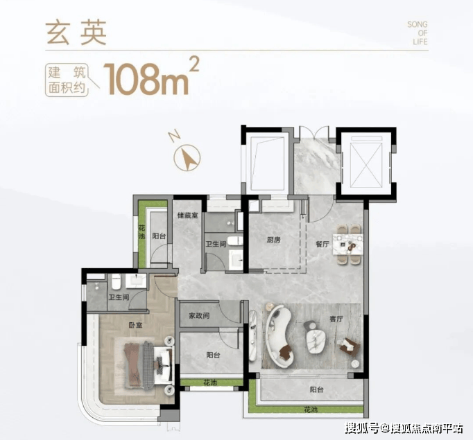 108㎡三房两卫是刚需主力款,三开间朝南,搭配270°飘窗,采光通风俱佳,空间利用率高,日常居住不局促;