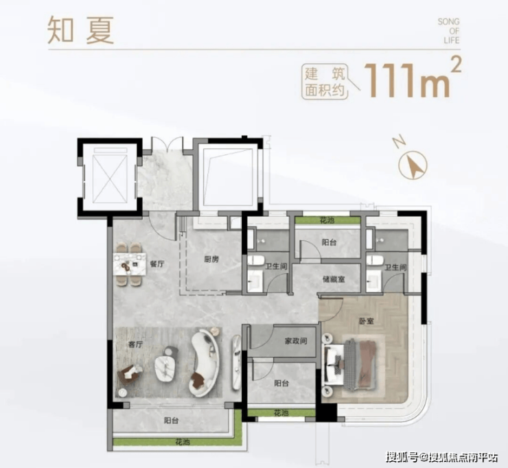 111㎡三房两卫总价约770万,布局方正,动静分区合理,满足三口之家的生活所需;