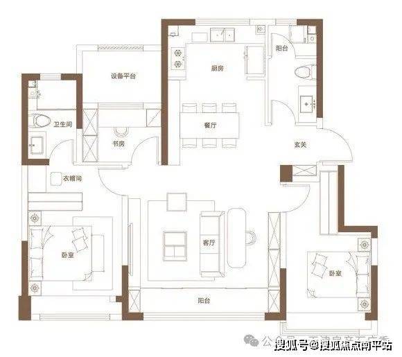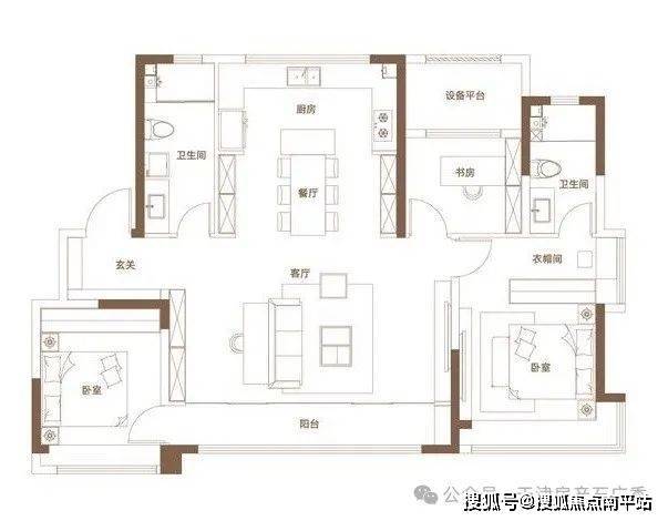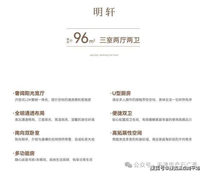 户型设计:全产品三室双卫户型,经典大面宽、短进深布局,优化采光与通风