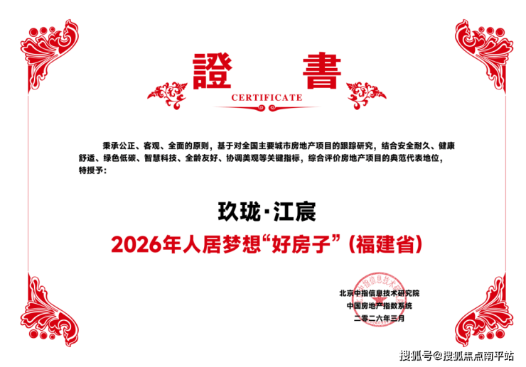 2026年3月26日,中国企业评价协会、清华大学房地产研究所、北京中指信息技术研究院主办,北京中指信息技术研究院中国房地产TOP10研究组承办的“2026中国房地产百强企业研究成果发布会暨第二十三届中国房地产百强企业家论坛”在北京召开。玖珑·江宸成功荣膺『2026年人居梦想“好房子”』奖项,作为本次百强发布会评选中漳州唯一入选项目,它也是漳州首个人居梦想“好房子”项目。