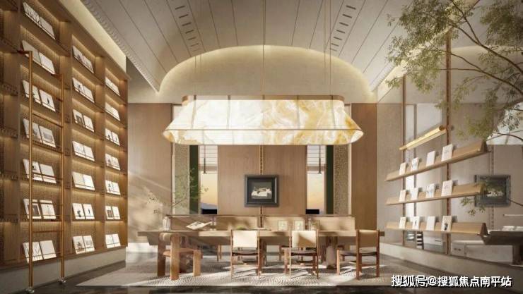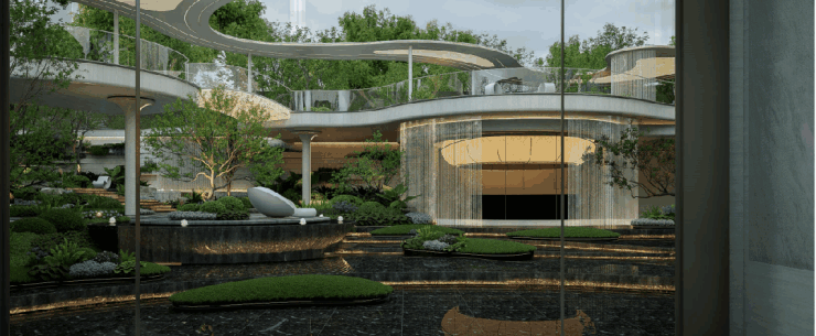现代东方雅韵园林,以王羲之《兰亭集序》为魂,融入曲水流觞的雅韵。 茂林修竹、群贤少长、求学问道等意,被巧妙融入下沉庭院、社区生态水景、入户门庭等景观之中,传统的文人古意雅趣,就成为可触摸、可沉浸的文化雅境。