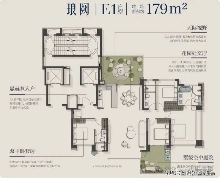 6#的179㎡户型,是五缘湾首个湾海四代宅,3.15米的层高,再加上两个近40平的超大空中庭院,真正实现了“别墅瞰大海”的理想生活,综合使用率接近100%。