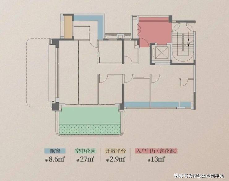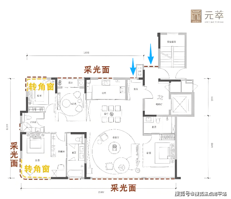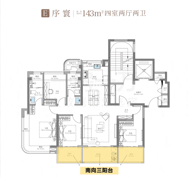 传统户型的电梯厅、玄关大多昏暗压抑,而新一代 143㎡户型实现了突破。