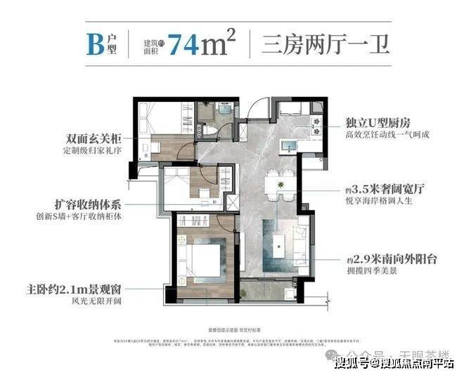 约74平3房,综合使用率高达约88%,采光好;舒适三房,最小房间都有约8平;客厅面宽达约3.5米,超大U型厨房,独立阳台,入户玄关柜+S墙扩容收纳,堪称同级完美户型!