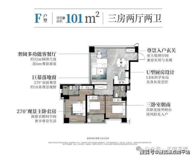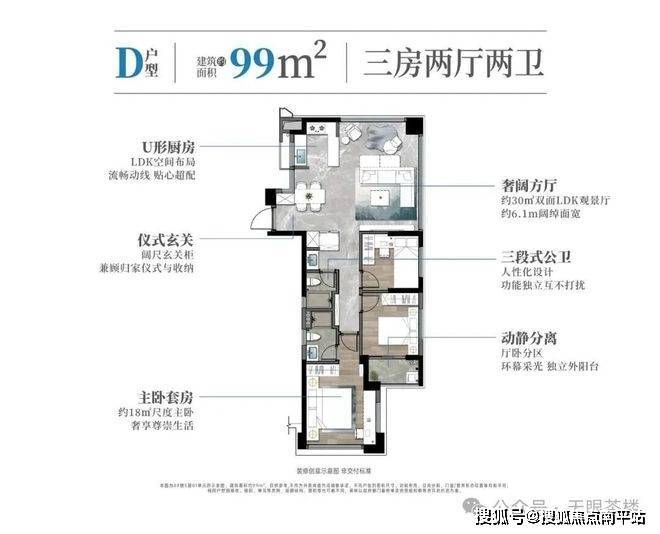 约99㎡3房2卫户型,位于1#东边套,所有房间+客厅都能实现东向瞰景!现在市面宣传的270°主卧+270°客厅视野,在七星湾TOD三期其实就已实现,过于低调了。约18㎡阔绰主卧,约30㎡LDK观景厅...该户型堪称奢享级瞰景3房户型,也可做成3+1房!