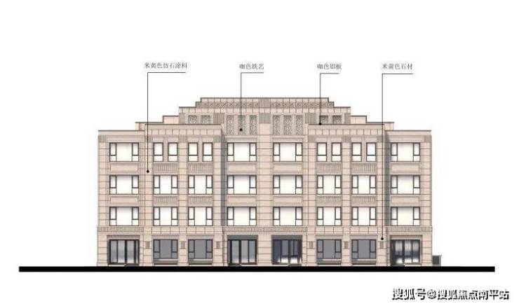 三段式立面构成,用颜色的深浅变化及线脚的凹凸纹理,强调建筑的韵律感与段落感。利用米黄色石材和米黄色仿石涂料营造出简约大气的建筑形象,再结合几何线条与活力的空间色彩,打造出一个法式轻奢主义的空间格调。