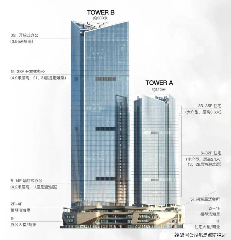整体业态:集商务写字楼、高端商业、空中会所,以及拥有70年产业高端住宅等多元业态于一体的金融岛尖地标综合体