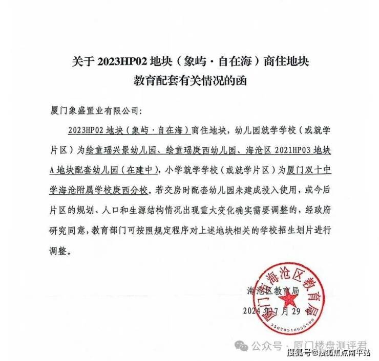 2024年7月29日,海沧教育局发函明确,象屿·自在海(2023HP02地块), 幼儿园就读于绘童瑶兴景幼儿园、绘童瑶庚西幼儿园、海沧区2021HP03地块A地块配套幼儿园(在建中);小学划片就读厦门双十海附庚西分校。