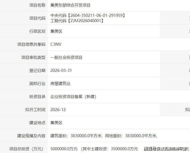 2026年3月31日,集美东部综合开发项目完成立项备案,标志着该片区开发进入实质性推进阶段。