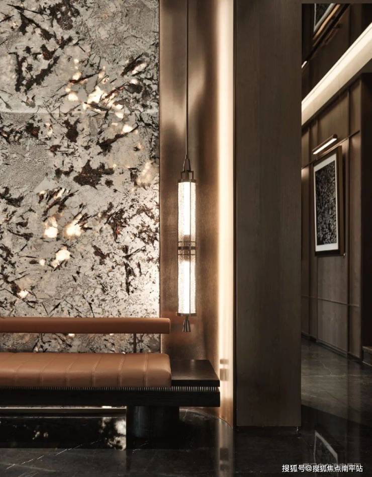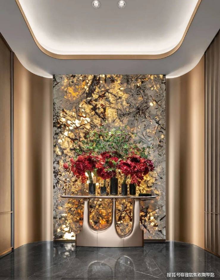 花艺从褐茶色墙面垂落,大理石纹理与金属线条勾出一道光的褶皱。这里不是过道,而是归家的第一首诗。