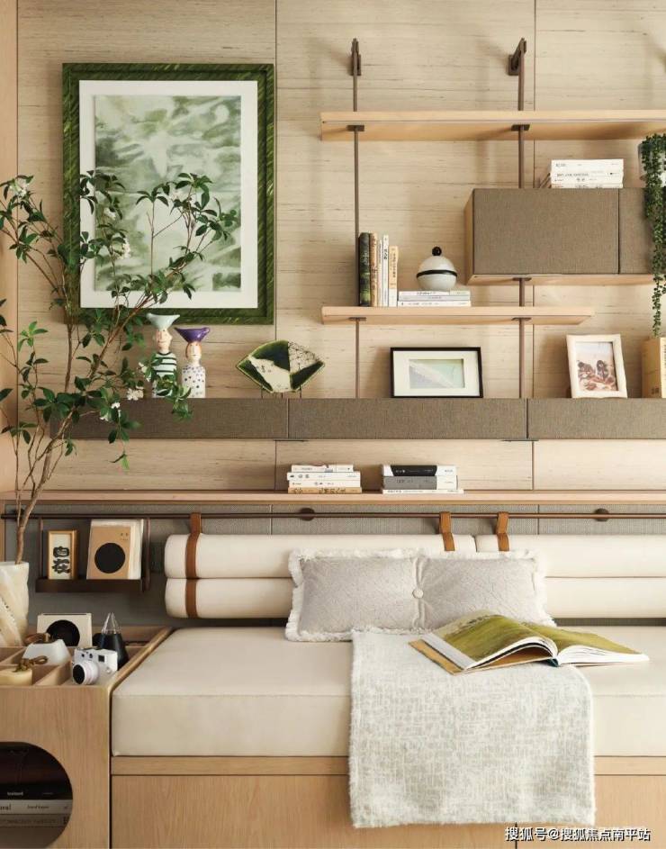 夕阳斜照时,原木色调的客厅镀上一层暖金,棉麻沙发、一片绿植与暖色灯光辉映,落地窗外,日光与树影正跳着无声的舞曲。