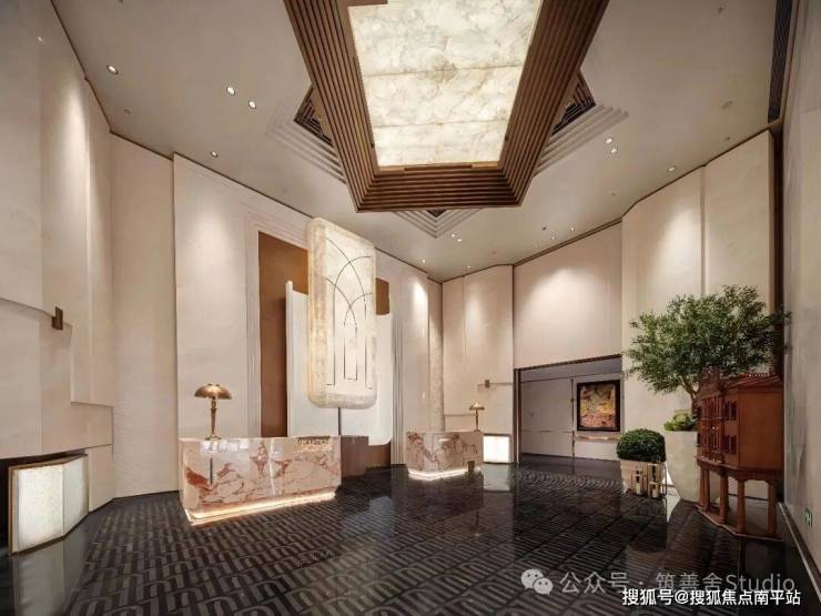 主入口门庭,超百米宽、7米高,以恢弘气势开启归家之旅,营造第一重归家仪式感。其设计灵感源自闽南官式大厝的中轴对称美学,精选潘多拉透光奢石、土耳其月光米黄石材、巴西梦幻蓝宝奢石等珍稀石材铺陈。入口处的“帆舞云海”艺术雕塑,以灵动抽象的线条勾勒帆影,将航海精神与当代审美巧妙融合,成为视觉焦点。