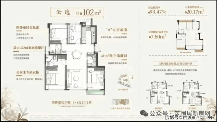 超高得房率是其最大亮点:89㎡得约91%,102㎡得约93.5%,112㎡得约92%。