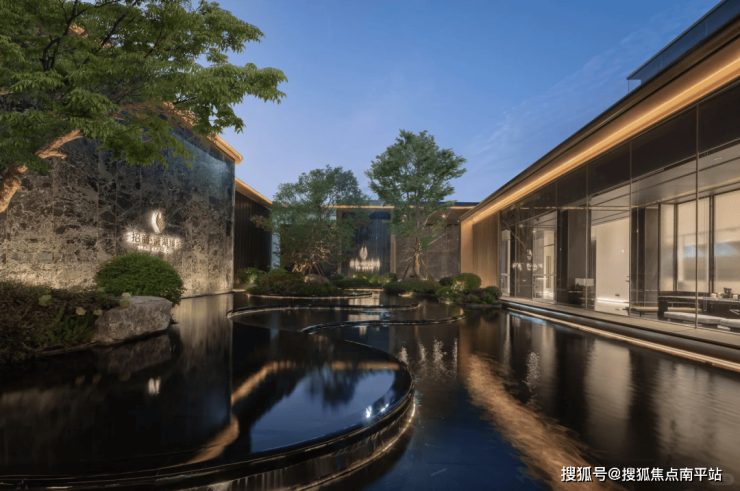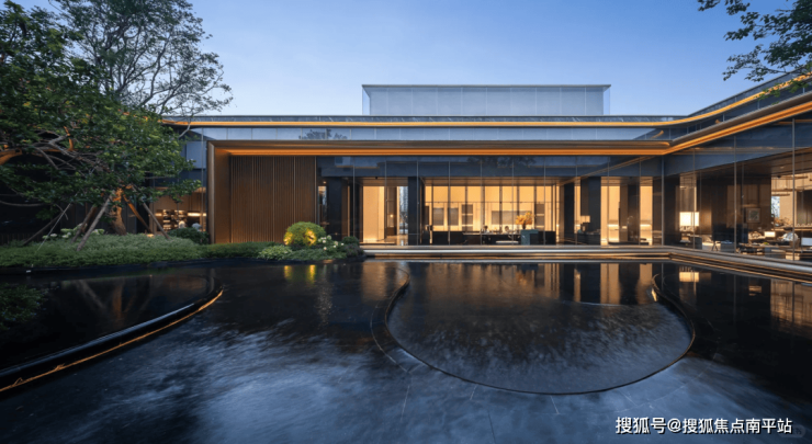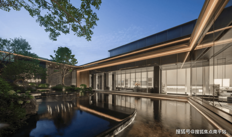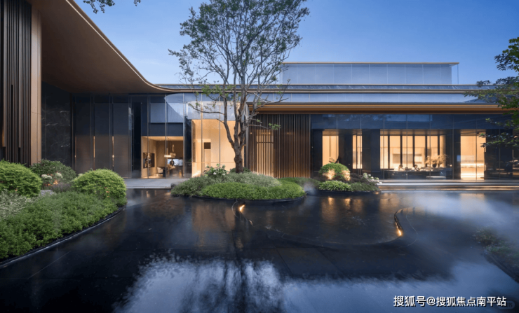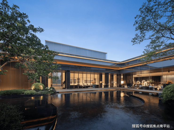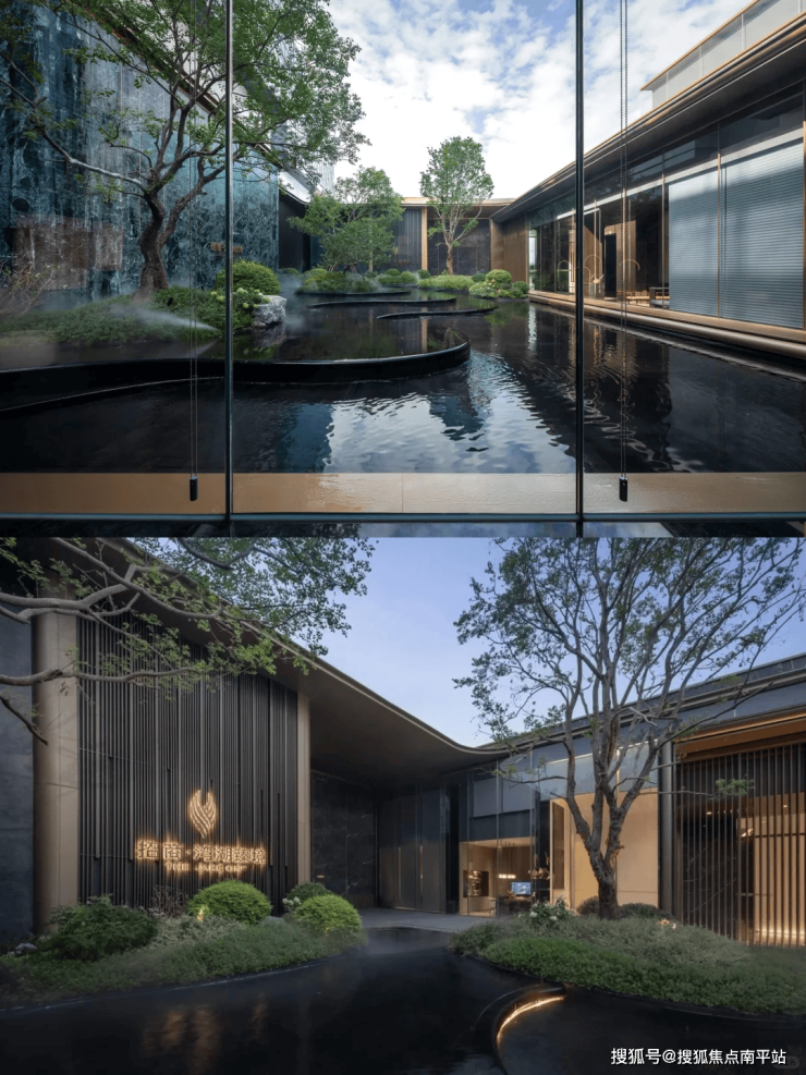 项目中庭特设下沉式悬浮会客厅,环抱三面水景,水波荡漾之外,延绵的连廊优雅展开。采用金属格栅屋顶,营造出半封闭式空间,既保证了隐私的舒适度,又让全景尽收眼底,彰显非凡品味。