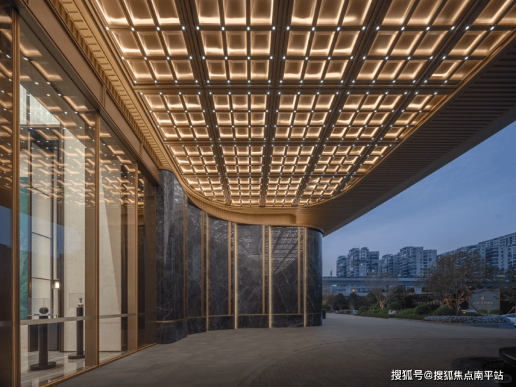 小区大门汲取国际知名度假瑰丽酒店的设计精髓,延绵200米的壮观界面,占地3300平方米的实景前庭景观,气势恢宏的62米形象主入口,挑高11米的宽敞大厅。独具匠心的酒店式环岛落客设计,营造出尊贵仪式感,尽显非凡气度。这里,定制玻璃与精选大理石交相辉映,香槟金色的金属曲线巧妙点缀,共同营造出一份非凡的质感和尊贵体验。