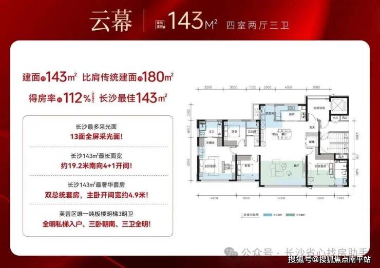 ——约19.2米南向全景视野 比肩传统建面约180㎡户型 得房率约112%(含私梯厅)