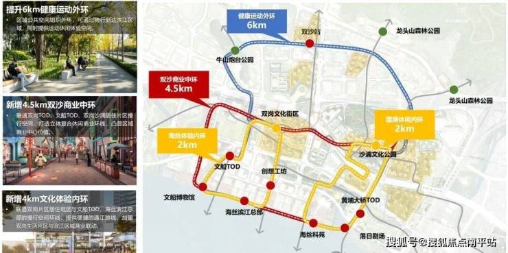 构建“两轴、一带、三廊、三环”的慢行系统网络,三环分别为6公里运动外环连接滨江,4.5公里商业中环连接华润万象系TOD商业,4公里文化体验内环连接各重要空间。