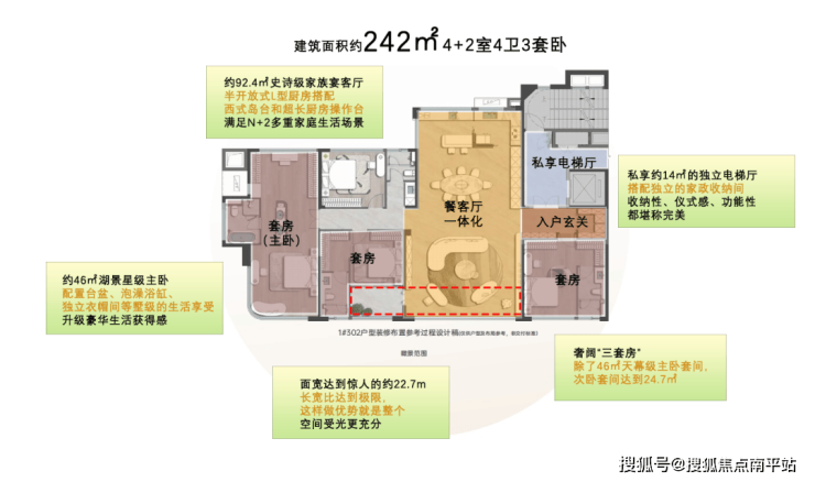 再来看建筑面积约 242㎡大平层, 空间综合使用率超99% (含 1/2阳台、设备平台、飘窗、电梯厅) ,同样室内也有同级别无法做到的获得感。